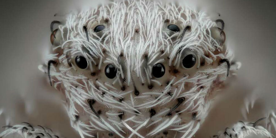 Opvallend aan de foto zijn natuurlijk meteen de vier ogen die recht in de camera (lijken te) kijken. De twee middelste ogen fungeren als een soort telelens. Met de twee buitenste ogen kan de springspin afstanden inschatten en vormen en bewegingen waarnemen. Fun fact: het gezichtsvermogen van springspinnen is het hoogst ontwikkeld van alle spinnen.