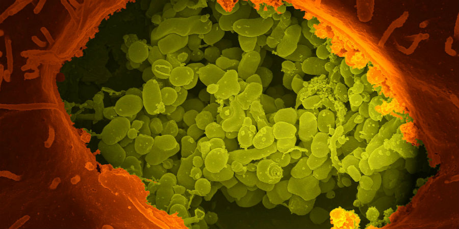 Door de Q-koorts moesten bovendien, om verdere verspreiding te voorkomen, tienduizenden drachtige geiten en schapen worden geruimd. De veroorzakers van Q-koorts zijn bacteriën van de soort Coxiella burnetii. Deze micro-organismen zitten in gastheercellen in zogeheten vacuolen: met vocht gevulde blaasjes. Zo’n vacuole is op deze foto opengebroken, waardoor we de snel delende bacteriën (groen) goed kunnen zien.