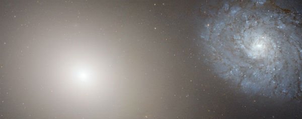 Sterrenstelsels kun je grofweg verdelen in twee soorten: elliptische stelsels en spiraalstelsels, zoals onze eigen Melkweg. Deze nieuwe foto van de Hubble Space Telescope toont van elk van beide typen een schoolvoorbeeld, gebroederlijk naast elkaar.