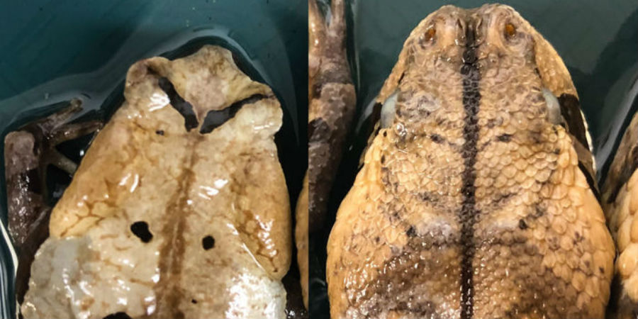 Op de foto is te zien hoe de kleur, vorm, vlekken en zelfs ongewoon gladde huid van de pad op die van de kop van een gabonadder lijken. Verder hebben herpetologen (biologen die reptielen en amfibieën bestuderen) de pad een geluid horen maken dat vergelijkbaar is met het sissende geluid dat de adder maakt voor hij toeslaat.