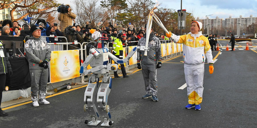 HUBO, ontwikkeld door het Korea Advanced Institute of Science and Technology (KAIST), ontving de fakkel van Dennis Hong, een werktuigbouwkundige verbonden aan de University of California, Los Angeles. Hong kwam zelf aan in een zelfrijdend overtuig. HUBO liep 150 meter met de belangrijke toorts en gaf hem daarna door aan zijn ontwikkelaar, professor Oh Jun-ho.