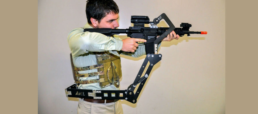 De robotarm, die aan beide kanten van een kogelwerend vest kan worden bevestigd, verlicht niet alleen de last van het dragen. Het apparaat ondervangt ook de terugslag van het geweer tijdens het schieten en de ARL test of de schutter er ook accurater mee kan knallen.