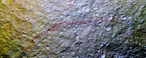 De nieuwste foto’s die NASA-sonde Cassini van Saturnusmaan Tethys heeft gemaakt, zien eruit alsof het zoontje van een van de onderzoekers er met zijn kleurpotloden op is losgegaan. Maar de ruwe, rode krassen over het oppervlak van de maan die je ziet op onderstaande foto zitten er écht.