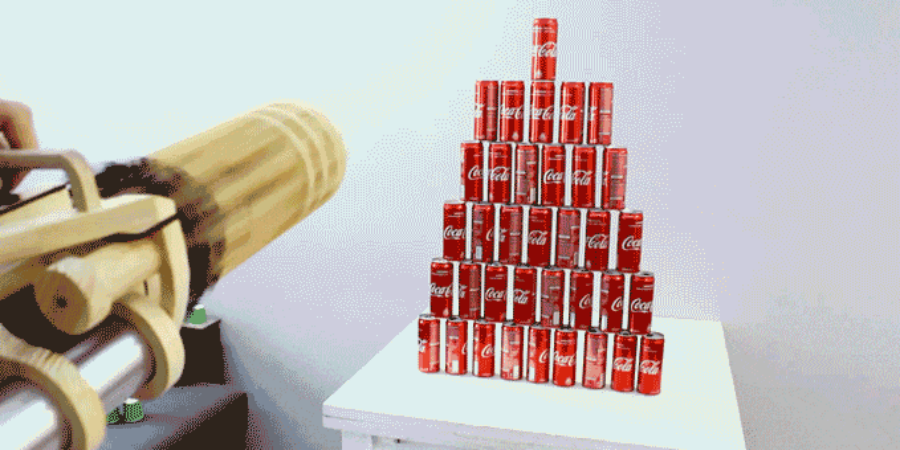 Het apparaat wordt gemaakt door een Amerikaans bedrijf met de bijzondere naam Weaponized T-Rex. Het houten Gatling-gun, uitgerust met maar liefst twaalf elektrisch aangedreven lopen, is gemaakt van CNC-gesneden multiplex. Het wapen kan geladen worden met 144 elastieken die met een (theoretische) vuursnelheid van 200 stuks per minuut door de kamer vliegen.