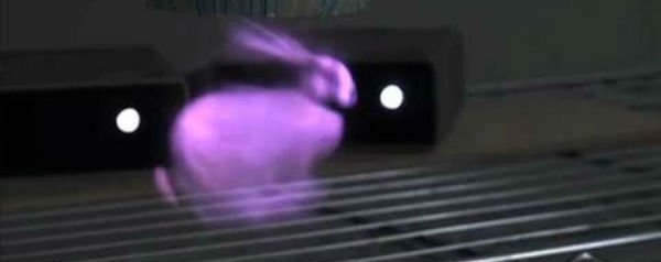 Al gaat het hier om een huppelend konijntje, het blijft een spookachtige verschijning. Een nieuwe projectietechniek uit Japan laat 3D-beelden tot leven komen in mist, recht voor je neus.