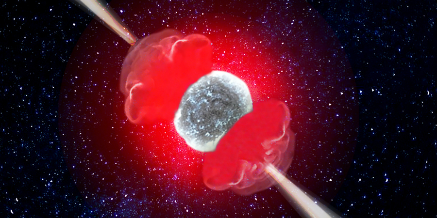 De dood van een superzware ster is een spectaculaire gebeurtenis. Zijn brandstof volledig opgebrand, bezwijkt de kern onder de zwaartekracht waarbij een razendsnelle schokgolf de buitenste lagen van de ster met hoge snelheid de ruimte in knalt. In sommige gevallen gaat zo’n explosie, een supernova, gepaard met een straalstroom die een flits gammastraling produceert – een gammaflits.