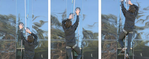 En hiermee wist de 70 kilogram wegende Elliot Hawkes dus een aantal meters tegen de glazen wand op te klauteren (zie het filmpje). Wel maakte hij gebruik van voetsteunen, die ook speciaal voor de klim waren ontwikkeld.