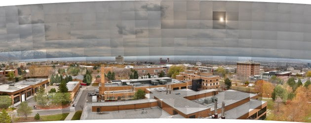 Ter illustratie: de afbeelding hieronder bestaat uit 611 foto’s, genomen vanaf het dak van de Universiteit van Utah. De onderzoekers hadden vier uur nodig om deze foto’s aan elkaar te plakken tot één afbeelding van 3,27 gigapixels (een deel te zien in de afbeelding hierboven; kijk hier voor het geheel). Maar met behulp van de ViSUS-software hadden ze in 2 seconden al een preview met een relatief lage resolutie van 0,9 megapixels.