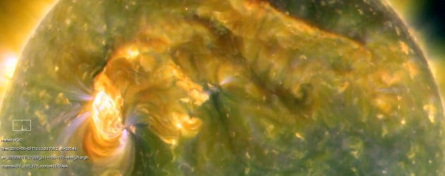 De twee STEREO-ruimtevaartuigen van de NASA legden de uitbarsting vast (te zien in dit filmpje). Een krachtige zonnevlam veroorzaakte een coronal mass ejection (of CME). CME’s bestaan uit biljoenen tonnen plasma die wegstromen van de zon, het heelal in. Het ontsnapte materiaal raakte het magnetische veld rond de aarde op dinsdag, wat prachtige poolluchten veroorzaakte.