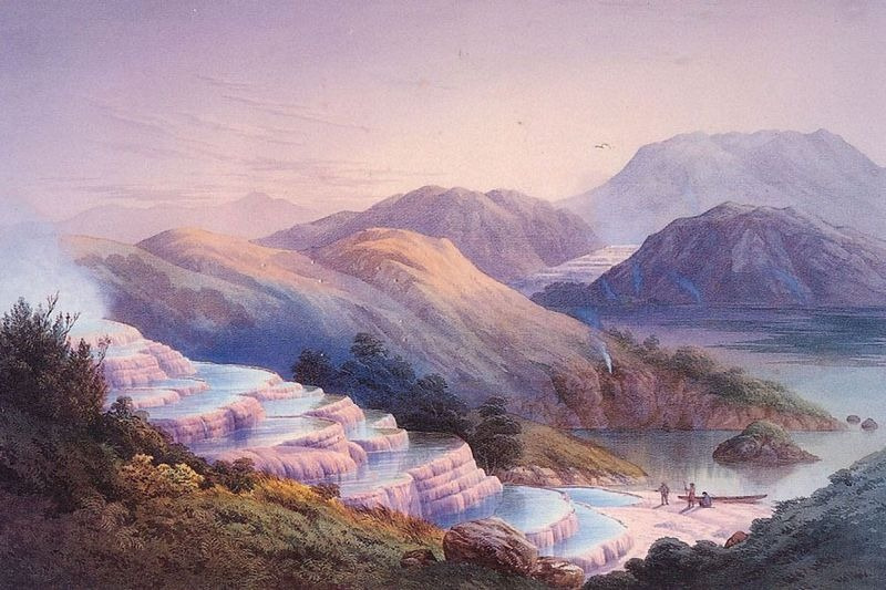 De roze en witte terrassen van Lake Rotomahana in Nieuw-Zeeland moeten prachtig zijn geweest. In de negentiende eeuw kwamen mensen van heinde en verre naar dit natuurschoon. Maar helaas was het in 1886 gedaan met deze mooie ‘trappen’ van silicaat. Een vulkaanuitbarsting vernietigde de terrassen. Of… toch niet?