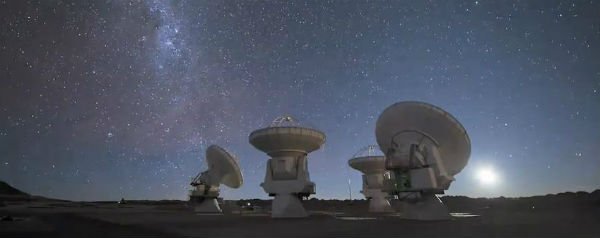 Onderstaand time-lapsefilmpje laat zien hoe mooi ons sterrenstelsel de Melkweg eruit ziet op deze afgelegen en extreem droge plek. Eronder staan vier van de ALMA-schotels, waarvan er drie steeds hun blikveld verleggen.