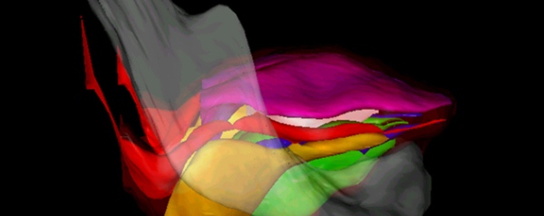 Door al die informatie te combineren, ontwikkelden ze een 3D-model waarmee duidelijk wordt op welke plek de individuele spieren zitten (de verschillende kleuren in de afbeelding) en hoe die spieren met elkaar verweven zijn. Dat zou kunnen leiden tot meer inzicht over de werking van deze roze lap.
