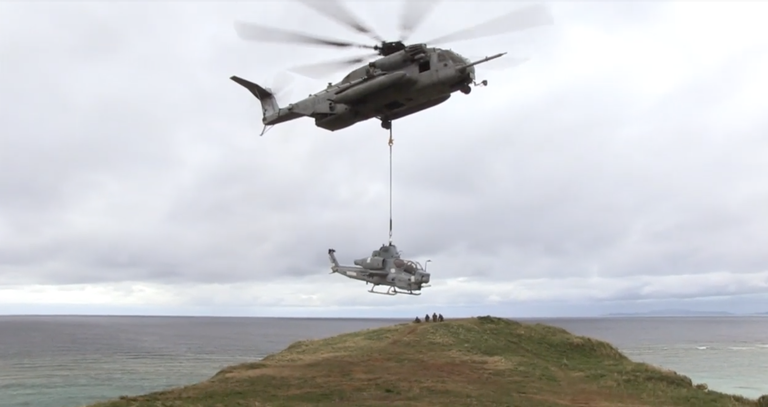 Om dat te oefenen, plukte een Sikorsky CH-53 Sea Stallion heavy lift helikopter een AH-1Z ‘Zulu’ attack heli van een eilandje voor de kust van het Japanse Okinawa. Puur cijfermatig gezien een eitje, want een AH-1Z attack weegt leeg 5580 kilo en de Sea Stallion kan, zonder zich erg druk te maken, 8000 kilo aan troepen of materieel meenemen. De CH-53 is dan ook een van de zwaarste transporthelikopters die de Amerikanen hebben.