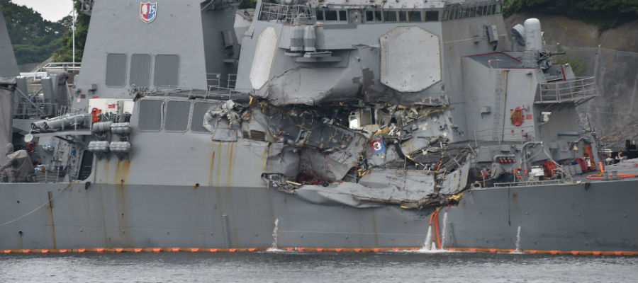 Vorige week botste het Amerikaanse fregat USS Fitzgerald tegen een Filipijns containerschip voor de Japanse kust. Hierbij liep de torpedobootjager flinke schade op en – erger nog – kwamen zeven bemanningsleden om het leven. De USS Fitzgerald moet nu terug naar Amerika komen, zodat het fregat kan worden gerepareerd, want zoals hij er nu uitziet, kan hij geen missies uitvoeren: