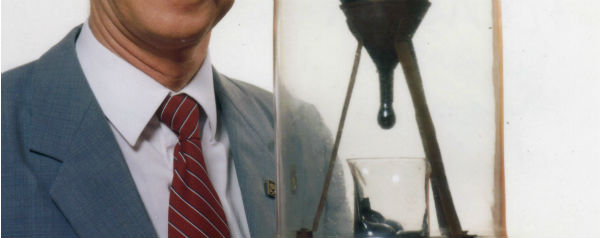 Het experiment met pek is bedoeld om aan te tonen dat het dikke spul in werkelijkheid vloeibaar is. Parnell sloeg een stuk bitumen (een soort pek, gemaakt uit aardolie) met een hamer in stukken, verhitte het, stopte het in een trechter en liet het drie jaar afkoelen. Daarna maakt hij de trechter open en begon het lange wachten op een druppel. En dat allemaal om aan zijn studenten te tonen hoe stroperig het spul is.