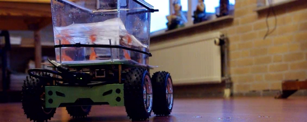 De tank zit op een wagen met vier wielen, die wordt aangedreven door een kleine elektromotor. Boven het aquarium is een camera, die neerkijkt op het water. Deze camera is aangesloten op een processor en detecteert de positie van de vis. Dit systeem is weer aangesloten op een computer, die de besturing regelt.