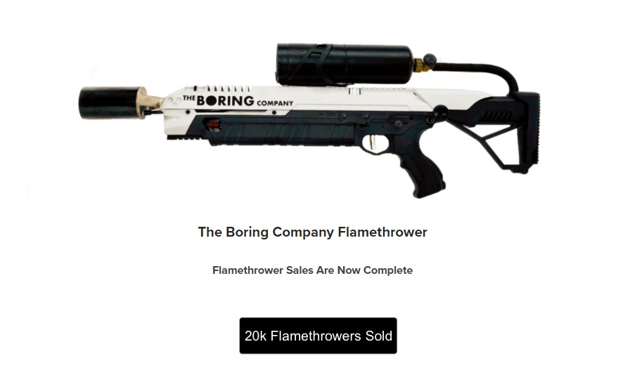 Nog maar vier dagen geleden berichtten we over de flamethrowers die The Boring Company van Elon Musk verkocht. Mensen konden via de website van het bedrijf een pre-order plaatsen en dan zouden de vlammenwerpers ergens in het voorjaar worden geleverd. Maar ja, wie wil er nou een vlammenwerper van 400 euro kopen?