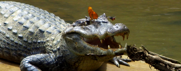 Toen in december 2013 een boot langzaam over Rio Puerto Viejo voer, kregen de passagiers onverwachts een bijzonder schouwspel te zien. Een vlinder en een bij lesten hun dorst met tranen van een kaaiman.