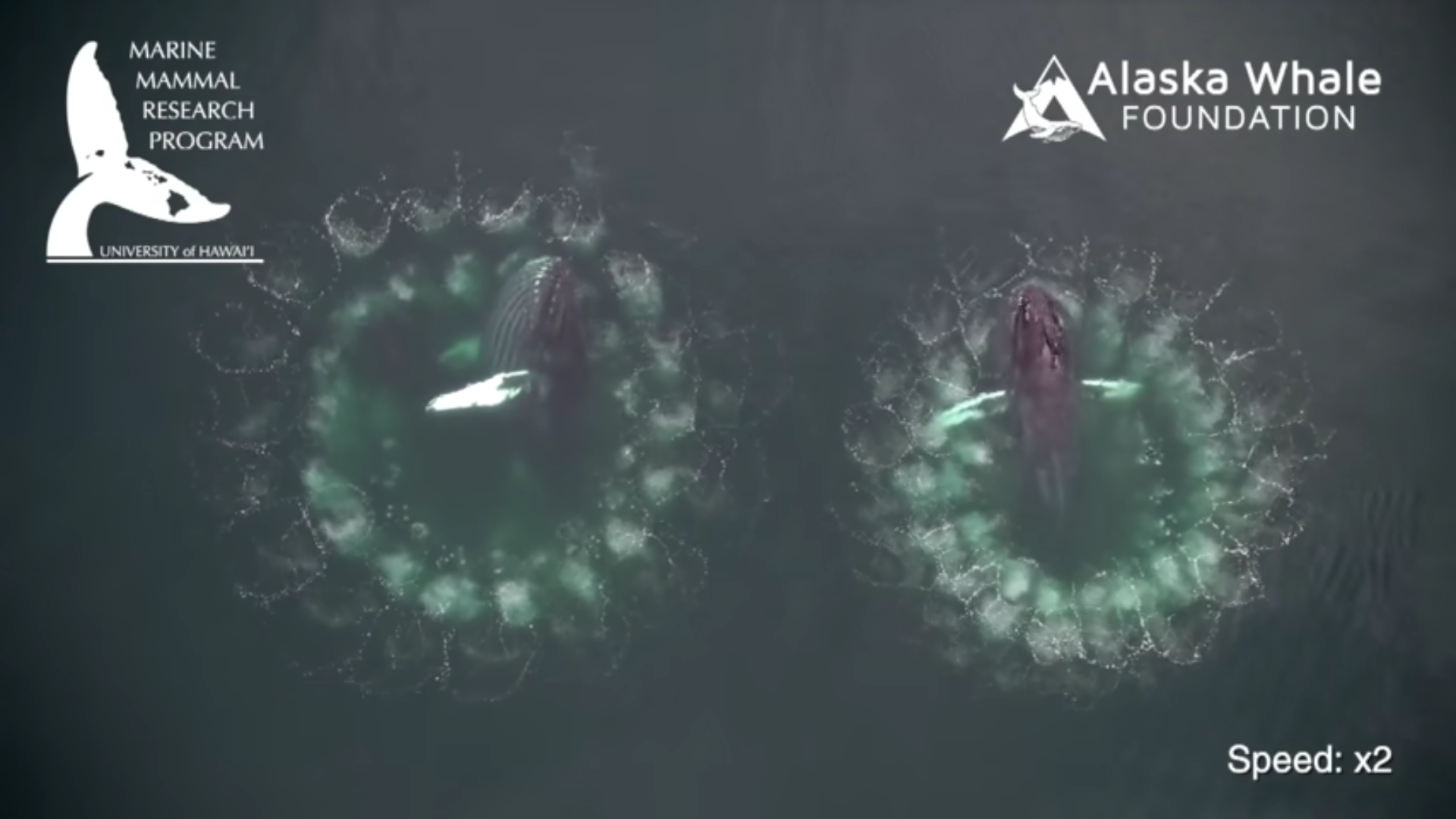 Met camera’s in de lucht en onder het water brachten onderzoekers een bijzonder fenomeen in beeld: bubbel blazende bultruggen op zoek naar hun maal.