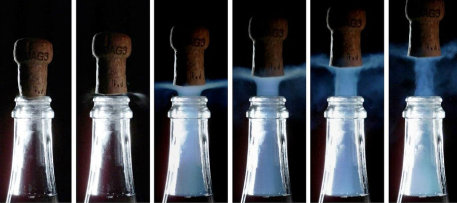 Wetenschappers ontkurkten een champagnefles bij 20 graden Celsius en filmden een bijzonder fenomeen: een prachtige blauwe pluim.