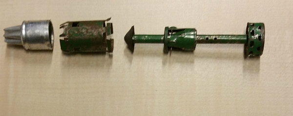Dirk-Jan Pelster, wijkagent/seniormedewerker/explosievenverkenner van de politie in Lelystad-Zeewolde, mailt: “Bij een garageopruiming in Lelystad kwamen mensen, naast wat oude munitie, losse flodders en hulzen, deze voorwerpen tegen. Ze hebben een lengte van 14 centimeter en een doorsnede van 18 millimeter. In het aluminium topstuk (ziet eruit als een spuitmondje) zit nog een messingkleurig ‘ding’. Het kopje heeft een gewicht van 4,45 gram en erin zit een rubberachtige substantie. Het totale voorwerp weegt ongeveer 30 gram, en is voornamelijk gemaakt van blik of dun metaal. Aan de onderzijde staat: ‘Made in West Germany’.”