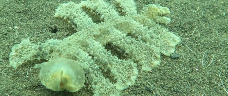 Een diertje op de zeebodem met dertien ‘poten’ en een kop die het als visnet gebruikt. Waar kijken we naar?