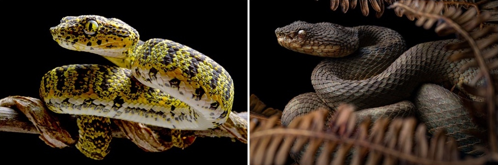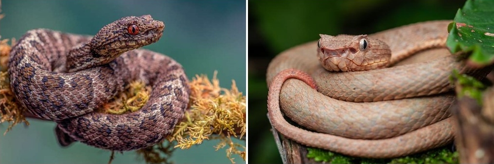 De relatief kleine ‘Eyelash Viper Snakes’ hebben een nogal opvallend uiterlijk. Ze hebben een reeks rechtopstaande schubben boven hun ogen, waardoor het lijkt alsof ze wimpers hebben. Of die schubben een functie hebben, is nog onbekend.