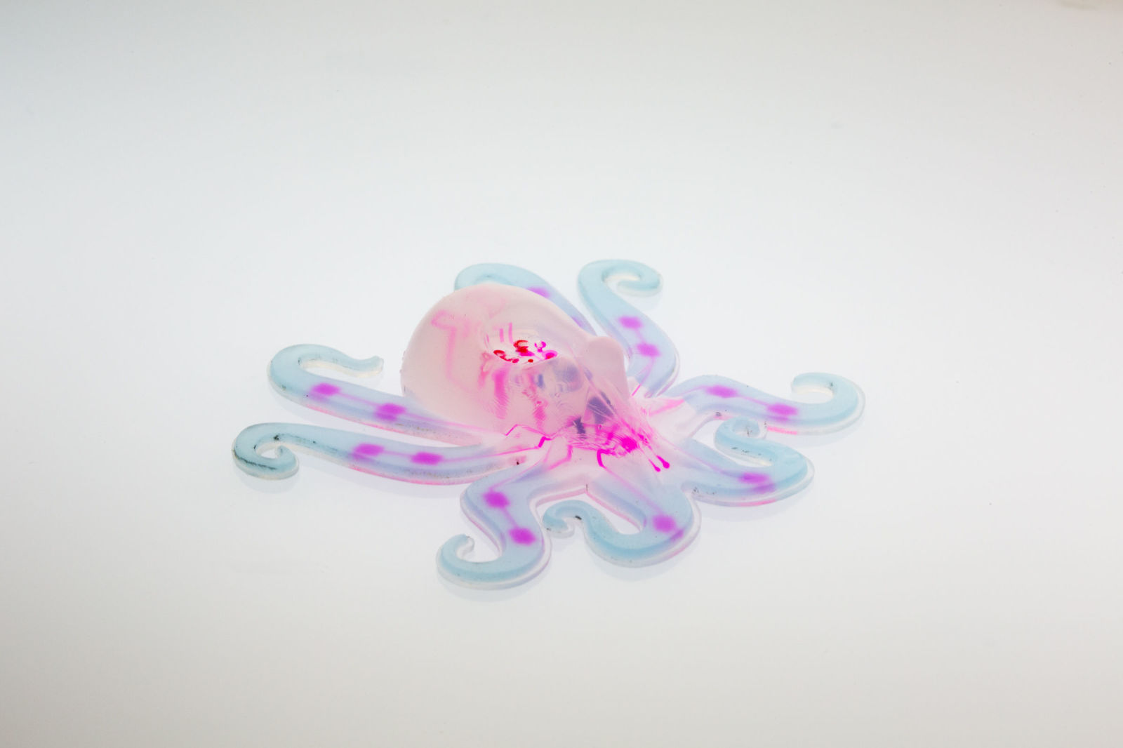 Dit is Octopot: een bewegend, batterijloos robotoctopusje uit de 3D-printer. De creatie gebruikt een klein, met vloeistof gevuld systeem dat als een soort chip werkt. Die chip kan in één of meer van de tentakels een kleine hoeveelheid waterstofperoxide vrijgeven die over een (eveneens vloeibare) katalysator met platinum wordt geleid. Door een chemisch reactie tussen de twee wordt de waterstofperoxide omgezet in een veel grotere hoeveelheid gas (zie het filmpje hieronder) en daardoor wordt de arm ‘opgeblazen’.