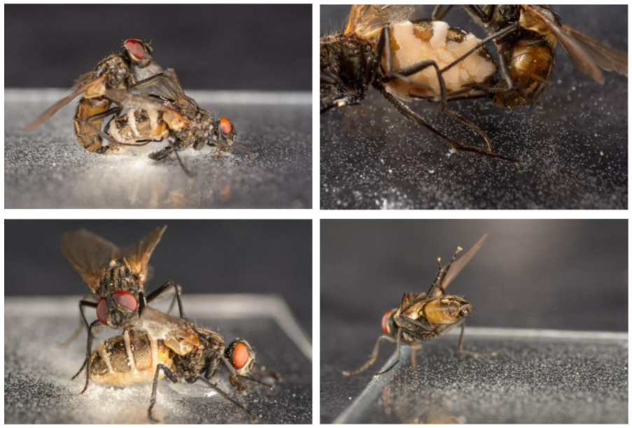 Héél dichtbij: het team achter het nieuwe onderzoek gaf mannetjesvliegen de keus te ‘paren’ met geïnfecteerde of niet-geïnfecteerde vliegenkarkassen. Hoewel de mannetjes geen duidelijke voorkeur hadden – necrofilie klaarblijkelijk geen enkel probleem – nam de hoeveelheid ‘paringen’ toe als er een karkas in een vergevorderd stadium van spoorvorming was. Anders gezegd: hoe meer schimmelsporen, hoe hitsiger de mannetjesvliegen leken.