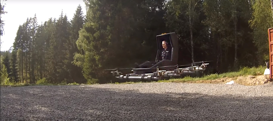 Gezeten in een imposante cockpitstoel stuurt de Zweedse piloot en ultieme knutselaar zijn vliegende stoel, of multikopter, tussen de bomen door. Het toestel heeft acht kleine, benzine-aangedreven motoren die elk een rotor aandrijven. Zonder problemen brengen die hem tot bijna 15 meter hoogte.