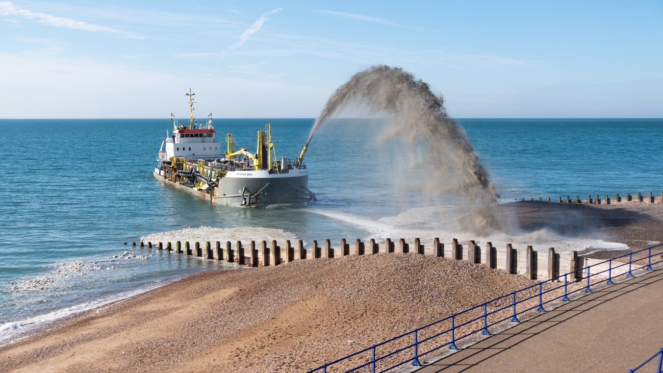 Dit betekent dat we per kilometer kustlijn 2,25 x 108 m3 moeten uitgraven. En doordat het uitgebaggerde zand een bijna twee keer zo grote soortelijke massa als water heeft, betekent dat zo’n 400 miljoen ton. In termen van vrachtwagens van 40 ton – het maximaal toegestane gewicht in de EU – komt dat neer op 10 miljoen vrachtwagens. En dat voor elke kilometer kustlijn. Ga er maar aan staan!
