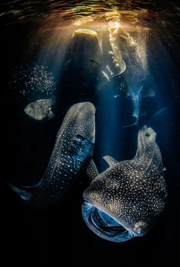 Walvishaaien zijn niet alleen groot, je komt de bedreigde vissen ook niet zomaar tegen. Een flinke prestatie dus dat Caballero het voor elkaar kreeg niet één, maar maar liefst vijf van kolossen ‘s nachts, sierlijk in één shot vast te leggen.