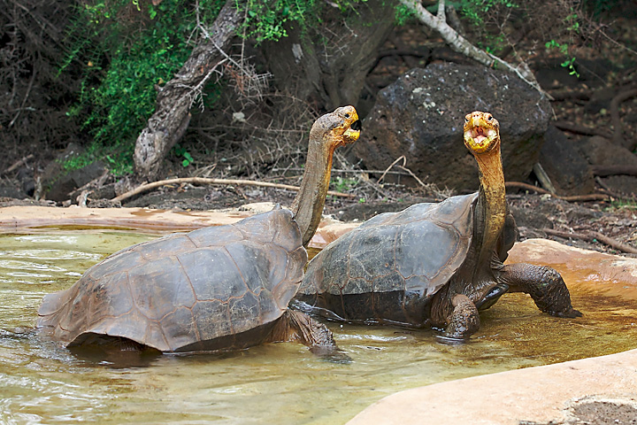Galapagos-reuzenschildpadden zijn de grootste, nog levende schildpaddensoort ter wereld, die met gemak honderd jaar oud worden. Ze zijn de inheemse bewoners van de zeven Galapagoseilanden, die behoren tot Ecuador, op zo’n duizend kilometer afstand van het vaste land van Zuid-Amerika. Vroeger domineerden deze oudjes de eilanden, maar door stroperij is de populatie flink onder druk komen te staan.