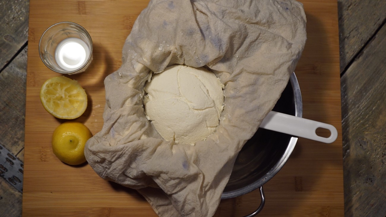 Voor het maken van 100 gram kaas heb je ongeveer een liter melk nodig. Je brengt de melk kort aan de kook en voegt er vervolgens een theelepel zout en het sap van een halve citroen aan toe. Het zuur zorgt ervoor dat de caseïne (het eiwit in melk) stolt en met het vet samenklontert. Als je deze witte klontjes met een doek of schuimspaan van het vocht scheidt, heb je kaas in handen; in dit geval een soort ricotta.