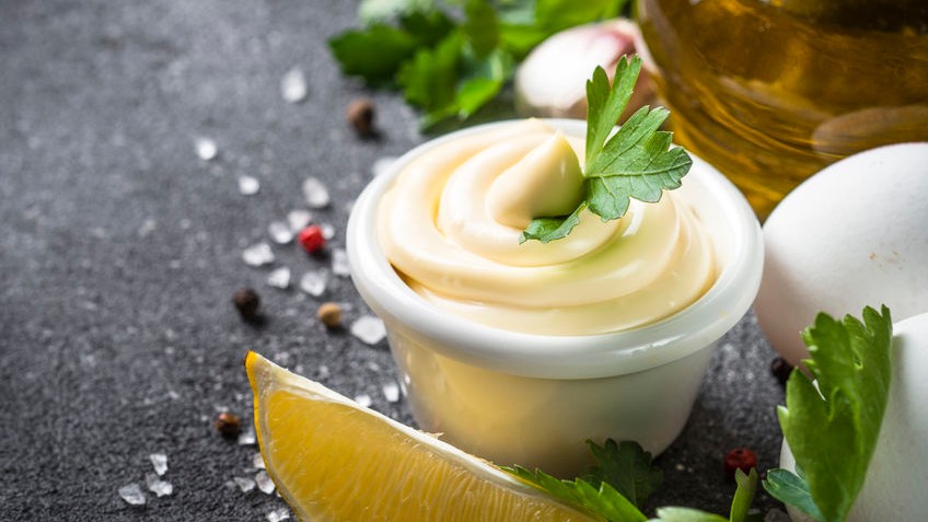 De drie basisingrediënten voor een eenvoudige mayonaise zijn: zonnebloemolie (250 ml), azijn (25 ml) en eidooiers (2 stuks). Als smaakmakers kun je hier nog mosterd, zout en peper aan toevoegen. Het maken van mayonaise heeft iets magisch. Je klopt verschillende vloeistoffen in korte tijd tot een romige, lobbige, stabiele massa. Het geheim hierachter zit verstopt in die eidooiers: lecithine.
