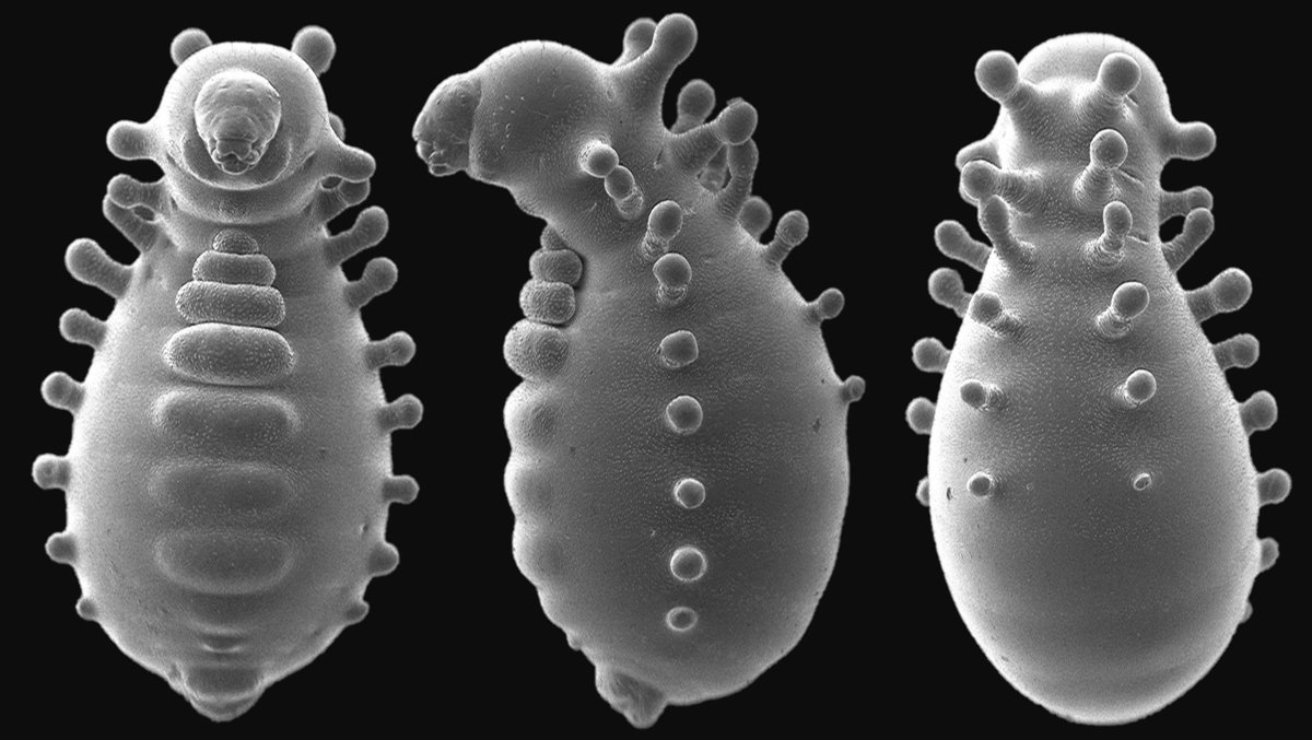 Dit bijzondere beestje is geen buitenaards wezen, maar de larve van een mierenkoningin van de Monomorium triviale-soort. Onderzoekers van verschillende Japanse universiteiten ontdekten onlangs dat de koningin bij deze mierensoort als larve 37 knobbels op haar lichaam krijgt.