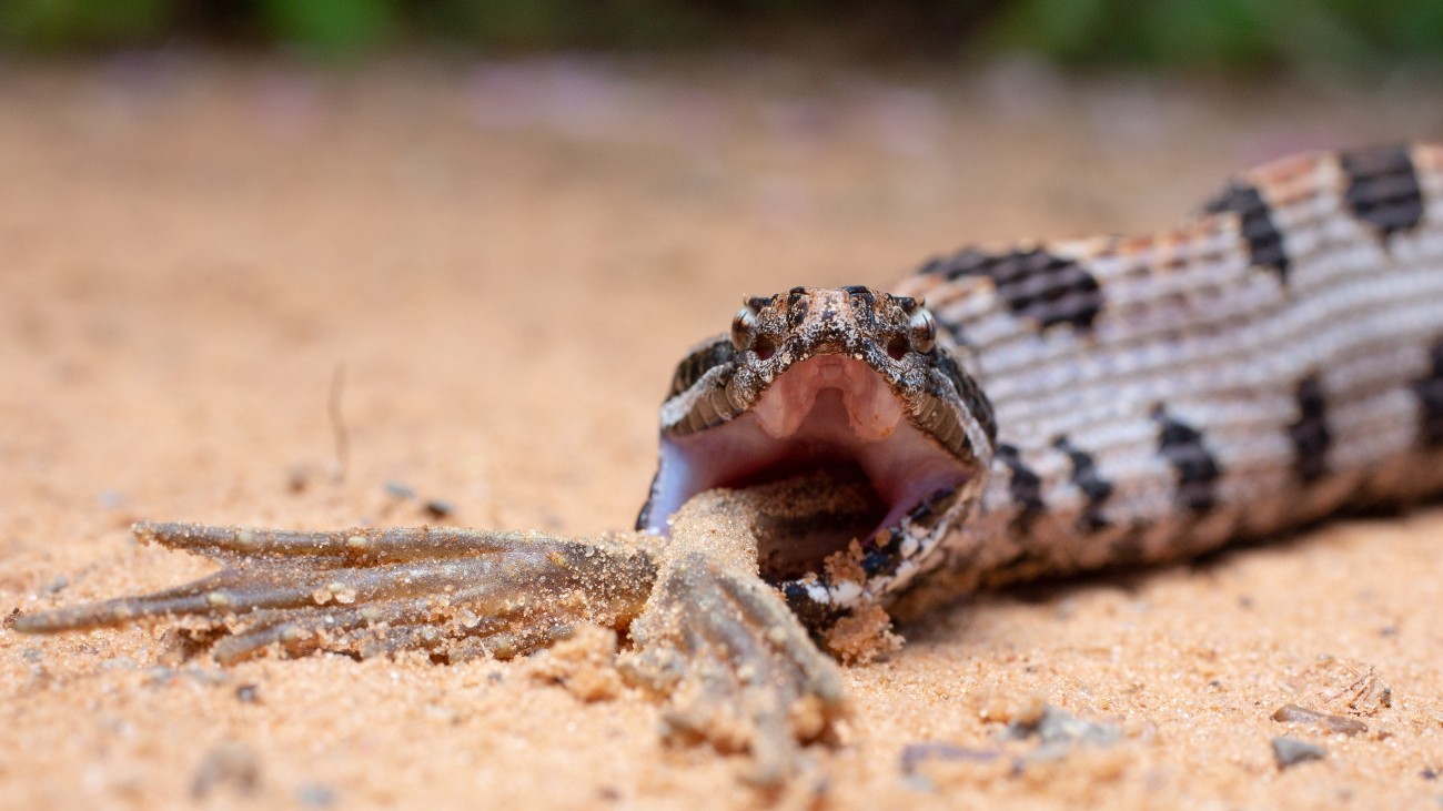 Beeld: De addersoort Sistrurus miliarius streckeri peuzelt een kikker op © Kyle Hutchison