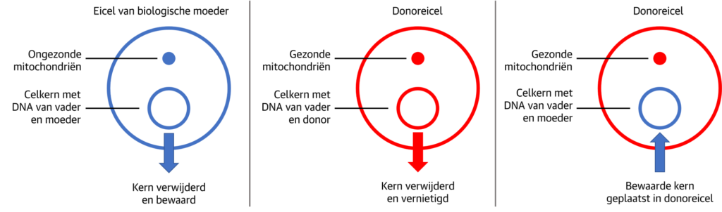 Vervolgens halen de artsen de kernen (met het DNA, maar zonder het mitochondriale DNA) uit beide eicellen. De kern van de biologische moeder plaatsen ze in de eicel van de van de donor, die gezond mitochondriaal DNA bevat. Zo beschikt de bevruchte eicel over de genetische informatie van de ouders, maar is het mitochondriale DNA afkomstig van de donor.