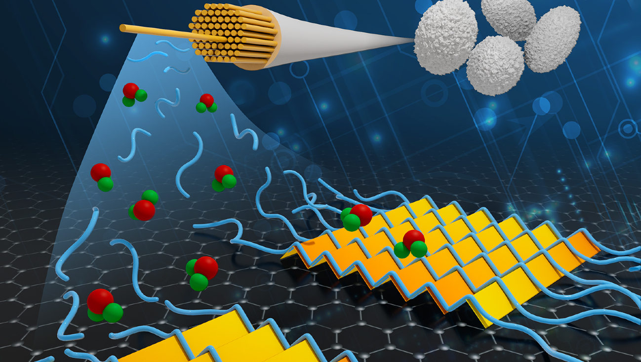 De onderzoekers kregen dit voor elkaar door heel precies de juiste laboratoriumomstandigheden te creëren waarbij de reacties goed liepen. Door vervolgens steeds als het ware één voor één de bouwstenen toe te voegen, ontstond de bèta-plaat – die half zo dik was als een DNA-streng. Die legden Shi en collega’s vervolgens op grafeen; een laag netjes gerangschikte koolstofatomen.
