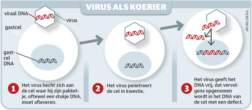 Gentherapie is een veelbelovend alternatief. In dit geval wordt een goed werkende variant van het defecte gen ingebracht in de stamcellen van de patiënt, die de taken van het defecte gen overneemt. Een arts haalt de cellen uit de patiënt en brengt ze naar het lab. Daar worden vervolgens de juiste genen toegevoegd, gebruikmakend van een virus, waarna de patiënt ze ‘terugkrijgt’.