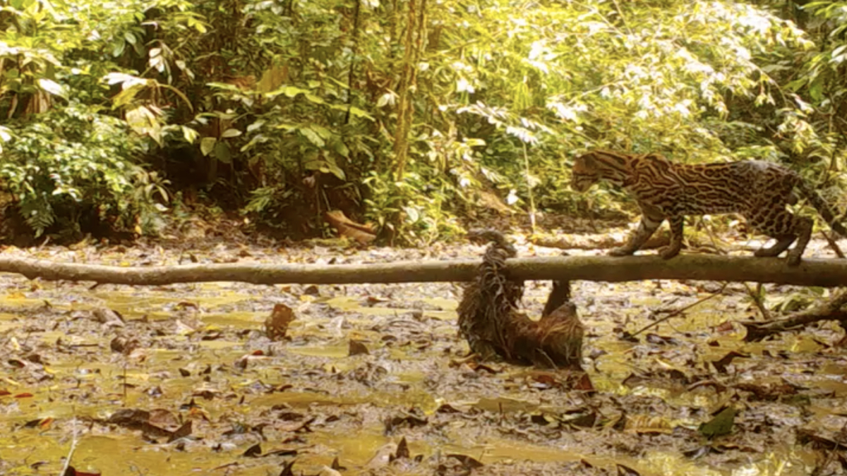 Ocelots jagen meestal op dieren die minder dan een kilo wegen. Maar af en toe staan ook middelgrote zoogdieren op het menu van deze katachtige. En de langzaam bewegende luiaard bleek een prooi die deze ocelot niet kon weerstaan.