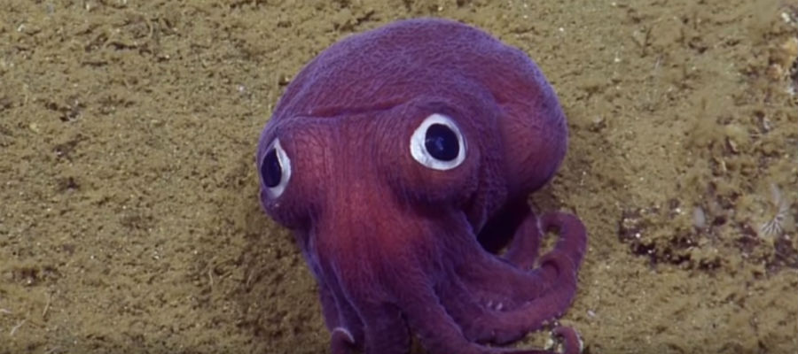 Wat je al niet op de zeebodem tegenkomt. In dit geval: een bizar schattig paars inktvisje.