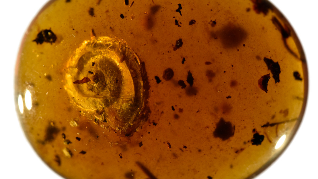 De mijnen in de Hukawng-vallei van Myanmar liggen vol met kostbaar amber. Daar is ook het honingkleurige stuk op deze afbeelding gevonden, dat een eigenaardig slakkenfossiel herbergt. In het wetenschappelijke blad Cretaceous Research geven weekdierdeskundige Jean-Michel Bichain en zijn team de nieuwe soort zijn naam: Archaeocyclotus brevivillosus – klein en harig.