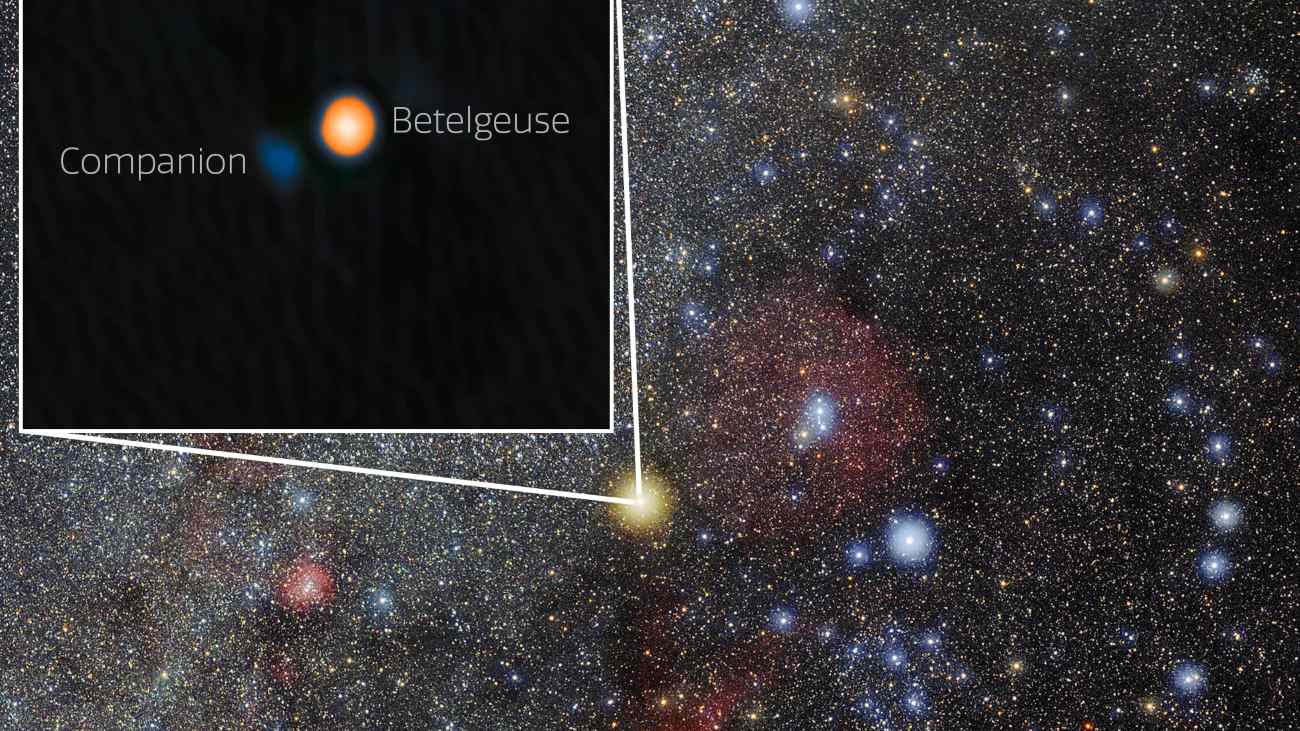 Betelgeuze is een van de helderste sterren die ’s nachts te zien zijn. Hij is gigantisch: ongeveer zevenhonderd keer zo groot als onze zon. De ster staat op zo’n 400 tot 600 lichtjaar van de aarde – in het sterrenbeeld Orion. Onderzoekers hebben nu ontdekt dat er waarschijnlijk een andere, kleinere ster rond Betelgeuze draait. Dat verklaart het vreemde gedrag van de ster.