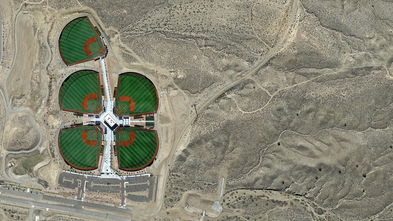 Een klavertje vier, denk je op het eerste gezicht. Maar als je wat beter kijkt, zie je waar het werkelijk om gaat. We hangen boven het Albuquerque Baseball Complex, voorzien van vijf afzonderlijke velden waarop Amerika’s op twee na favoriete sport kan worden gespeeld. (De populairste, American football, wordt eveneens op het complex beoefend en voor basketbal moeten de Albuquerqueianen elders in de stad zijn.)