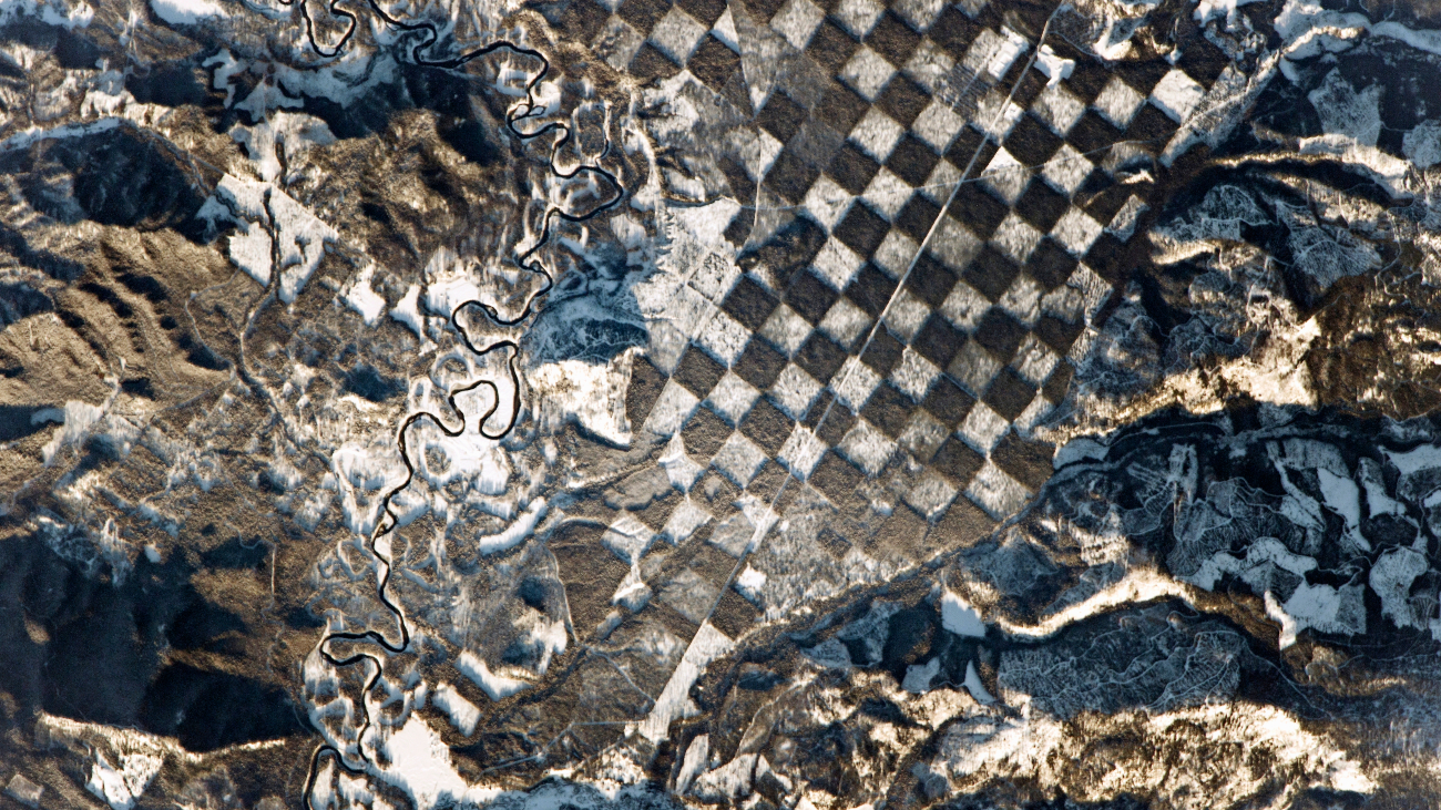 Nee, deze foto werd genomen vanuit het ISS. Wat je ziet, is het gevolg van bosmanagement in de Amerikaanse staat Idaho. Om de biodiversiteit daar te behouden, maar er toch hout te kunnen winnen, wordt het ene vierkante stuk bos gekapt en laat men het stuk ernaast intact. Zo ontstaat een dambord met vlakken van zo’n 400 bij 400 meter. In dit geval is de sneeuw blijven liggen op de min of meer kale stukken, maar bleef de winterse neerslag niet hangen in de boomkruinen van de onaangeroerde delen. In Google Earth is de opname trouwens ook in groentinten te bewonderen.