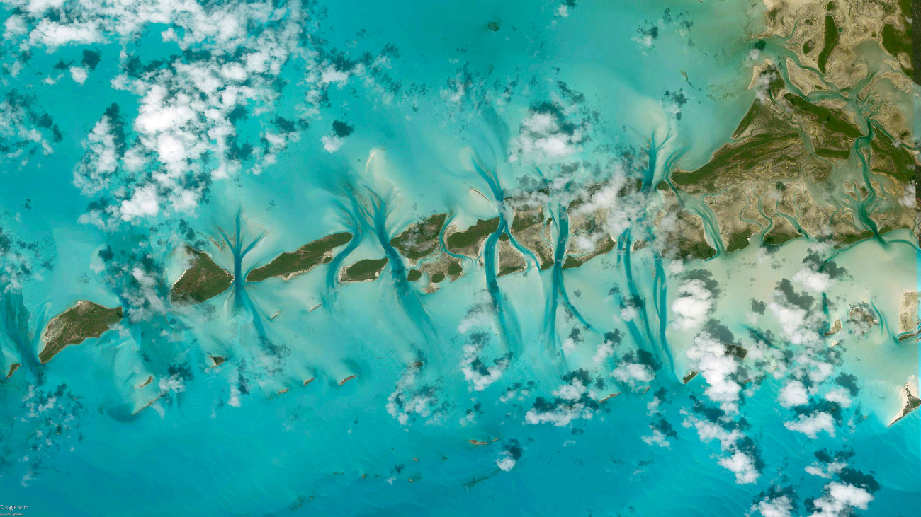 We hangen boven een paar uitlopers van Great Exuma, het grootste van de meer dan 365 eilanden die samen het Exuma-district van de Bahama’s vormen. De uitlopers zijn zogenoemde cays, een soort minieilandjes die bovenop een koraalrif zijn gevormd. Ze bestaan bijna helemaal uit opgehoopte resten van dode planten en dieren. Kleine getijdeverschillen zorgen ervoor dat het water met kracht door de geulen tussen de cays wordt gejaagd en dat levert dit soort fraaie patronen op.