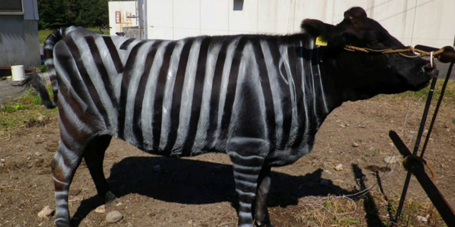 Het is een bekend beeld. Koeien die wild met hun staarten staan te zwiepen in een verwoede poging het aantal vervelende insectenbeten te beperken. Japanse onderzoekers zijn mogelijk op weg het de dieren iets gemakkelijker te maken. Niet met pesticiden, maar met een laagje verf. Door zwarte runderen van witte strepen te voorzien, zo schrijven ze in vakblad PLOS One, raken bijtgrage vliegen in de war. Het resultaat: minder beten, blije koeien.