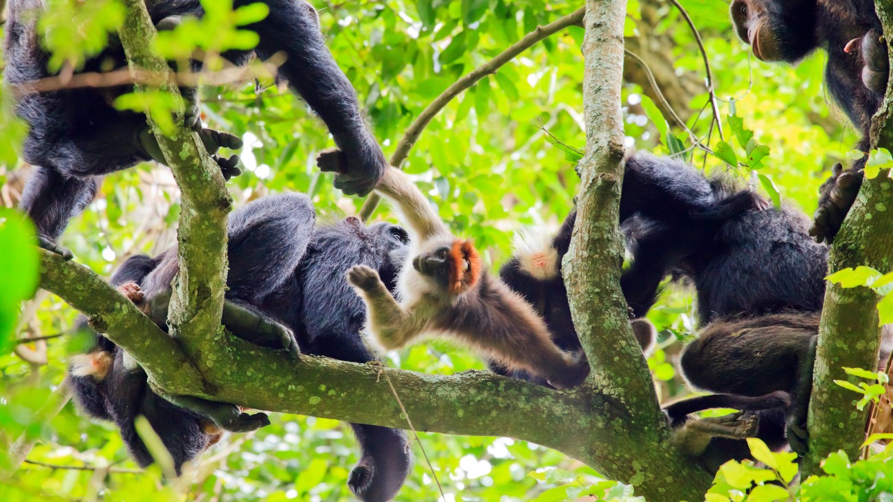 Beeld: Hoog in de bomen jaagt een groep chimpansees op een kleinere primatensoort: een rode franjeaap. © CC BY Kibale Chimpanzee Project