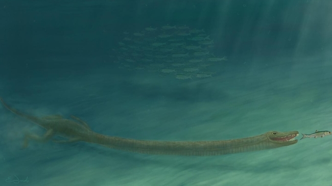 Gedetailleerde 3D-reconstructies van Tanystropheus-schedels tonen aan dat deze bizarre reptielen in het water leefden in plaats van op het land, verklaren onderzoekers.